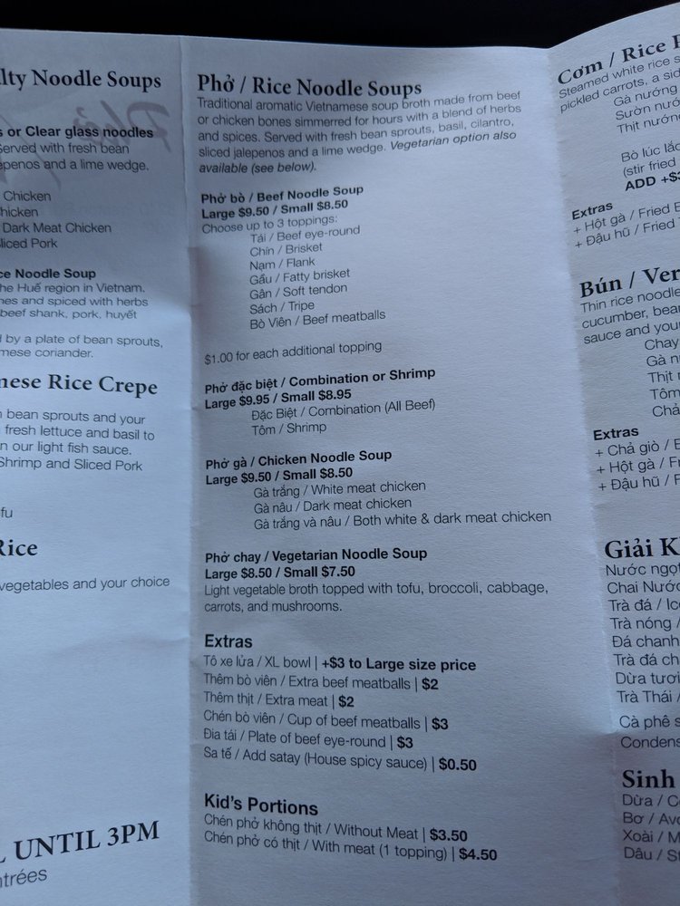 Beef broth spiced with star anise, whole cloves, cardamom pods, cinnamon sticks, onions. Served with thin rice noodle and a side of vegetable.